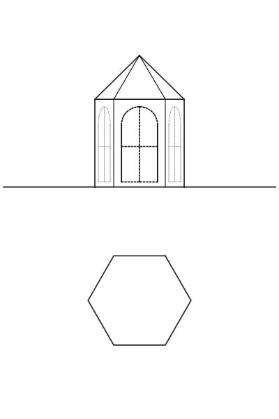 六角形の平面の屋根です。屋根勾配が45度の六角錐の屋根のインスタントハウスとなります。
