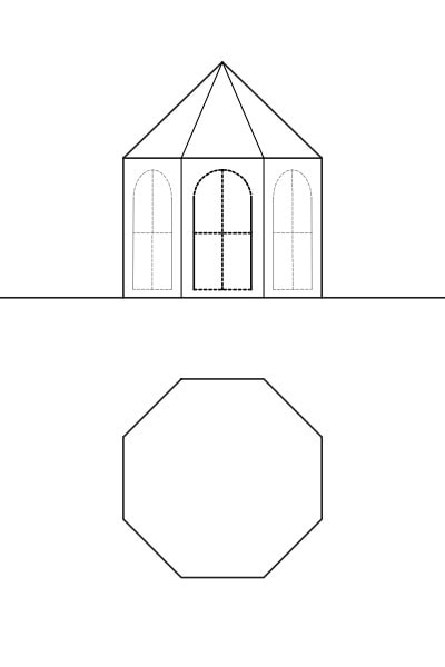 八角形〜十角形の平面の屋根です。屋根勾配が45度の八角錐のインスタントハウスや、緩勾配の十角錐のインスタントハウスとなります。